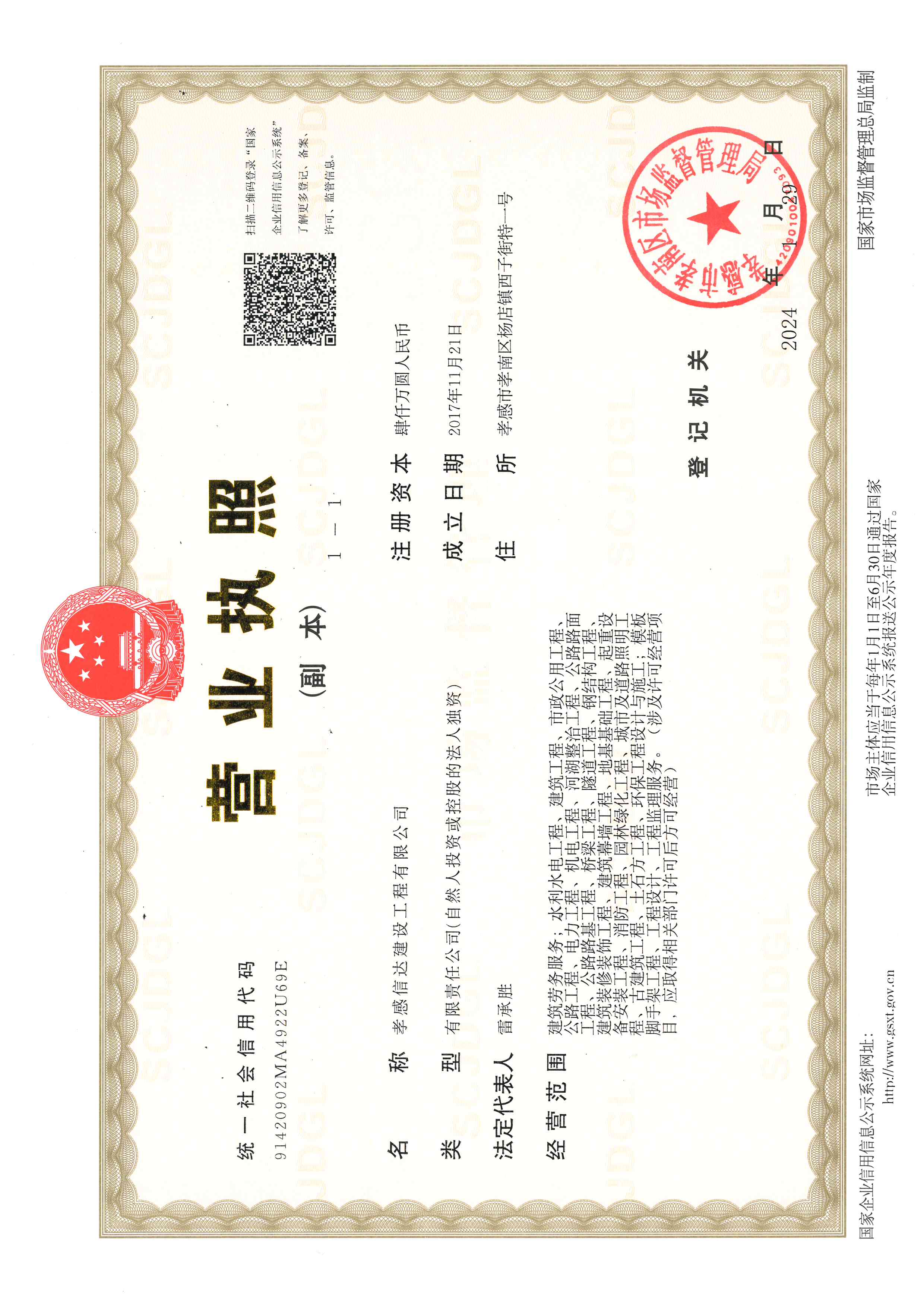 孝感信達(dá)建設(shè)工程有限公司成立于2017年11月21日,地址:孝感市孝南區(qū)楊店鎮(zhèn)西子街特一號(hào),注冊(cè)資金4000萬元,有限責(zé)任公司(自然人投資或控股)。